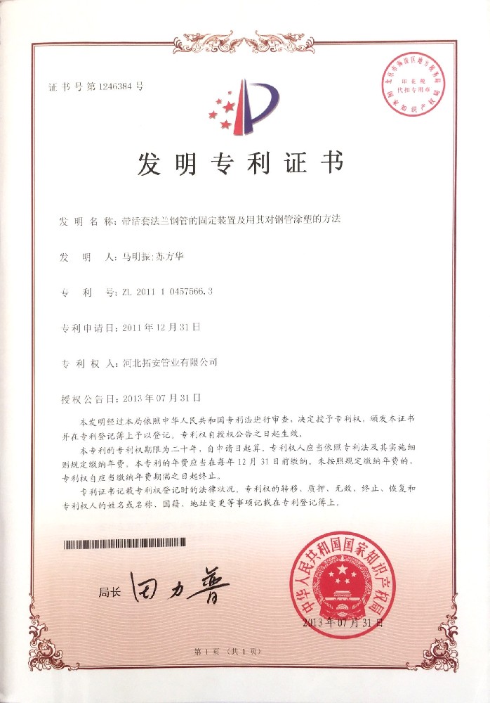 帶活套法蘭鋼管的固定裝置及用其對鋼管涂塑的方法證書